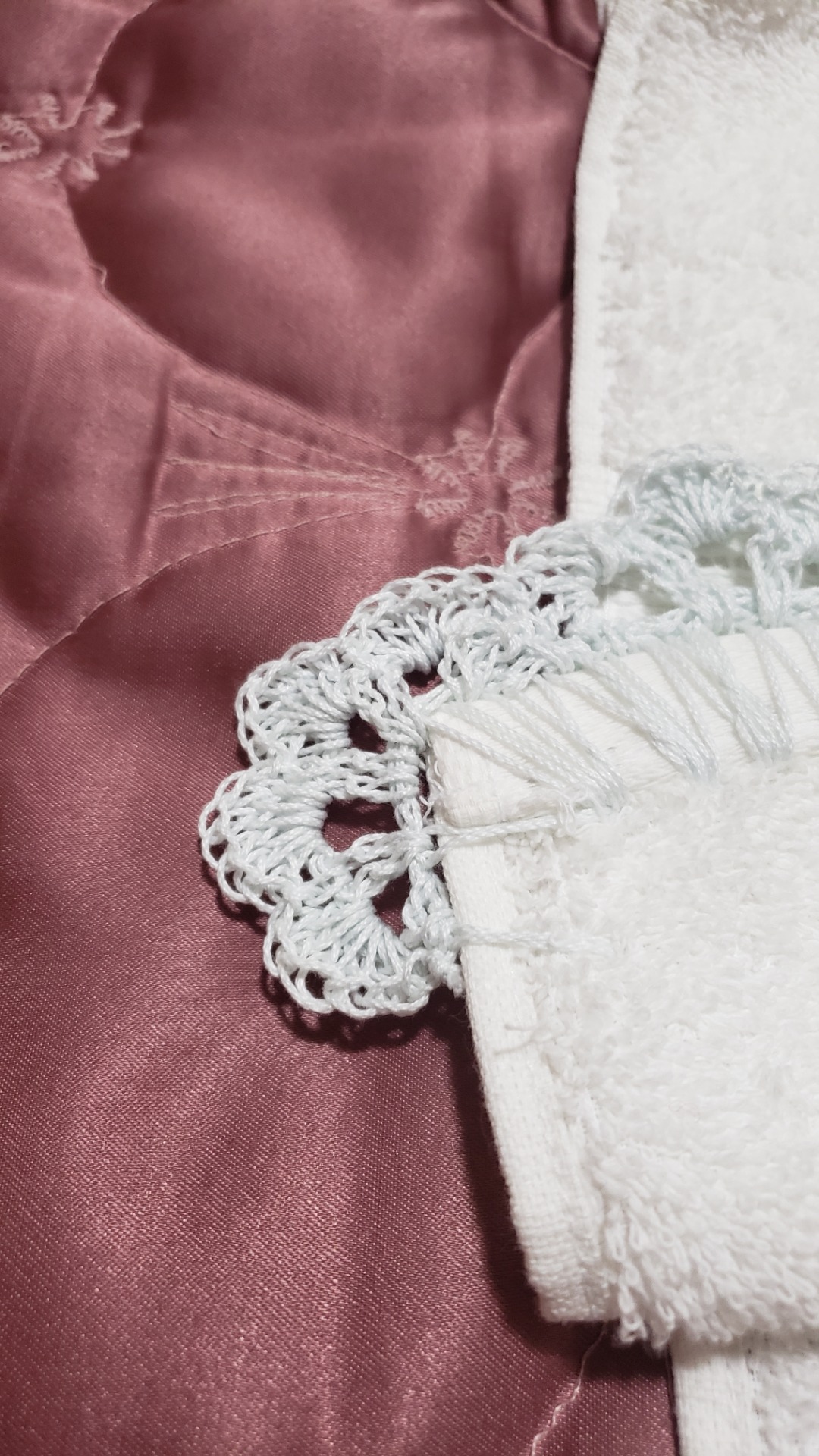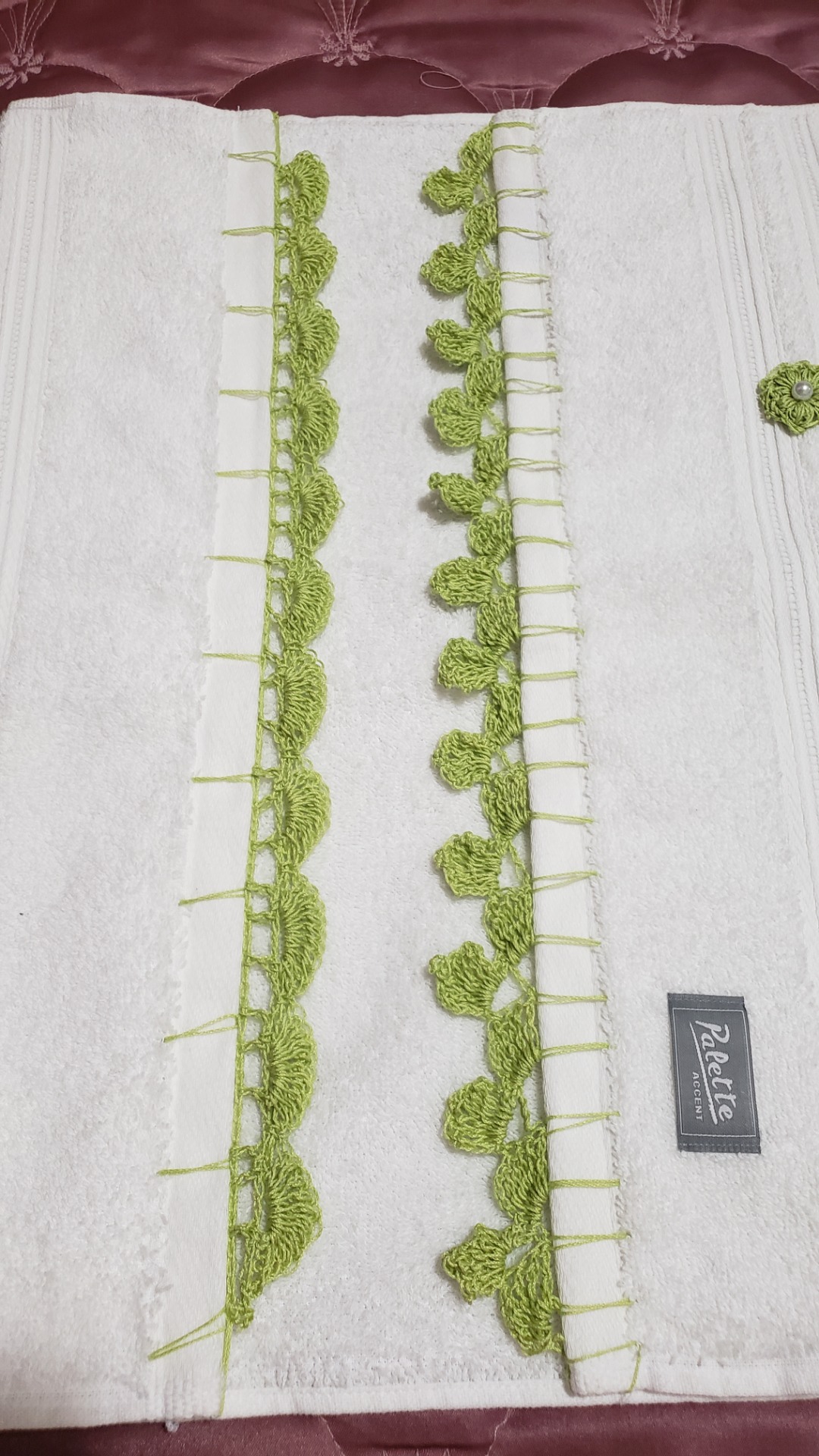 Toallas de alta calidad, con intervenciones en su borde inferior o superior, a crochet, con distintos motivos. Disponibilidad de varios colores